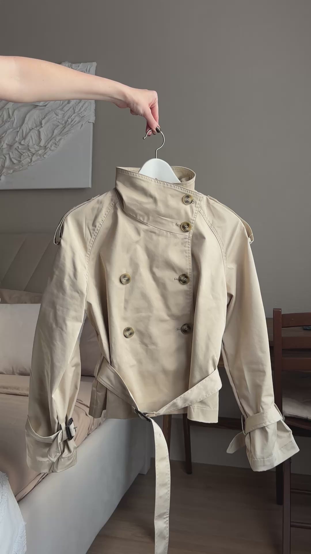 Son col montant protecteur, sa ceinture ajustable et sa coupe structurée dessinent une silhouette élégante tout en offrant une excellente isolation face aux vents d’automne et d’hiver.