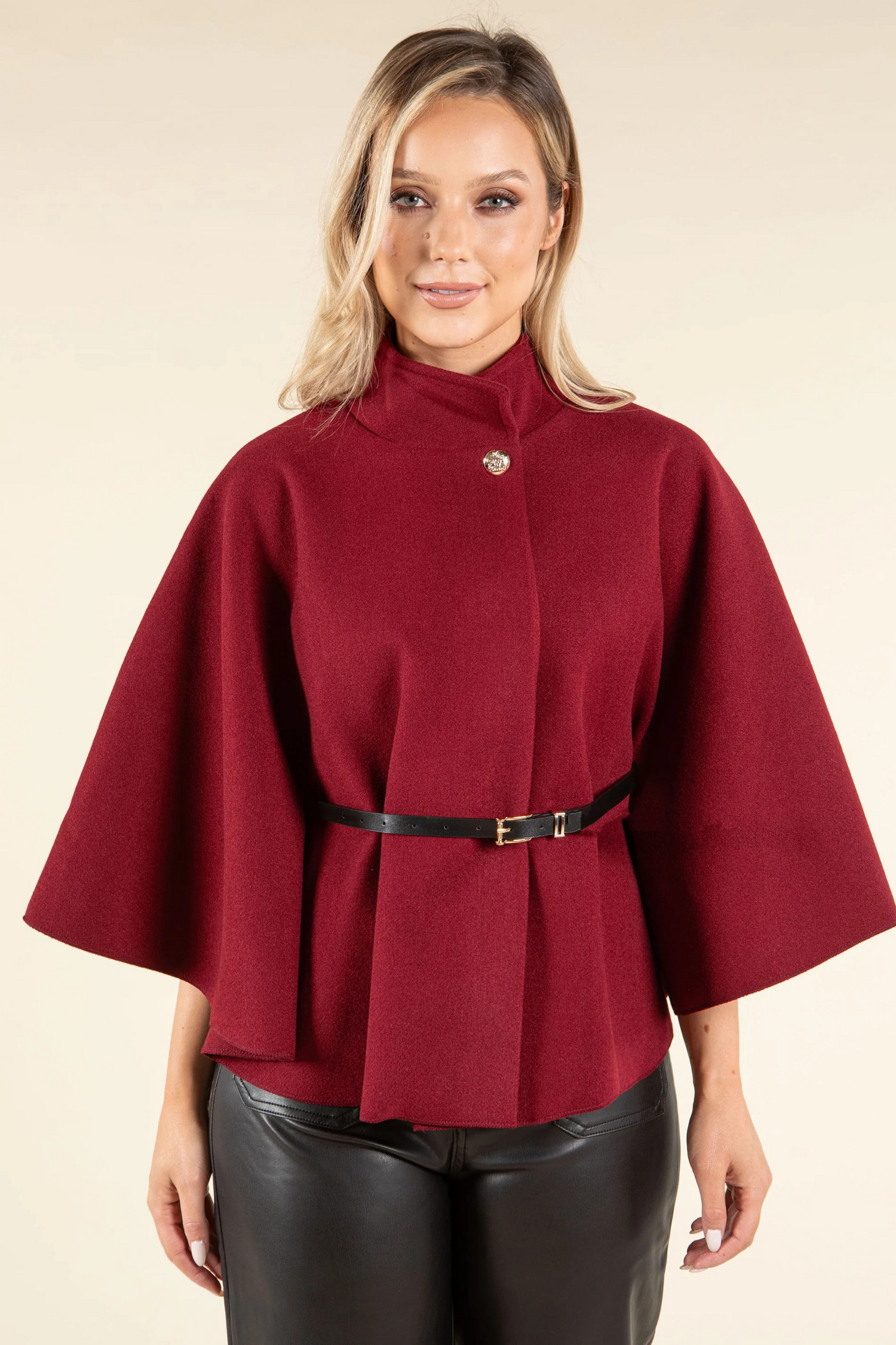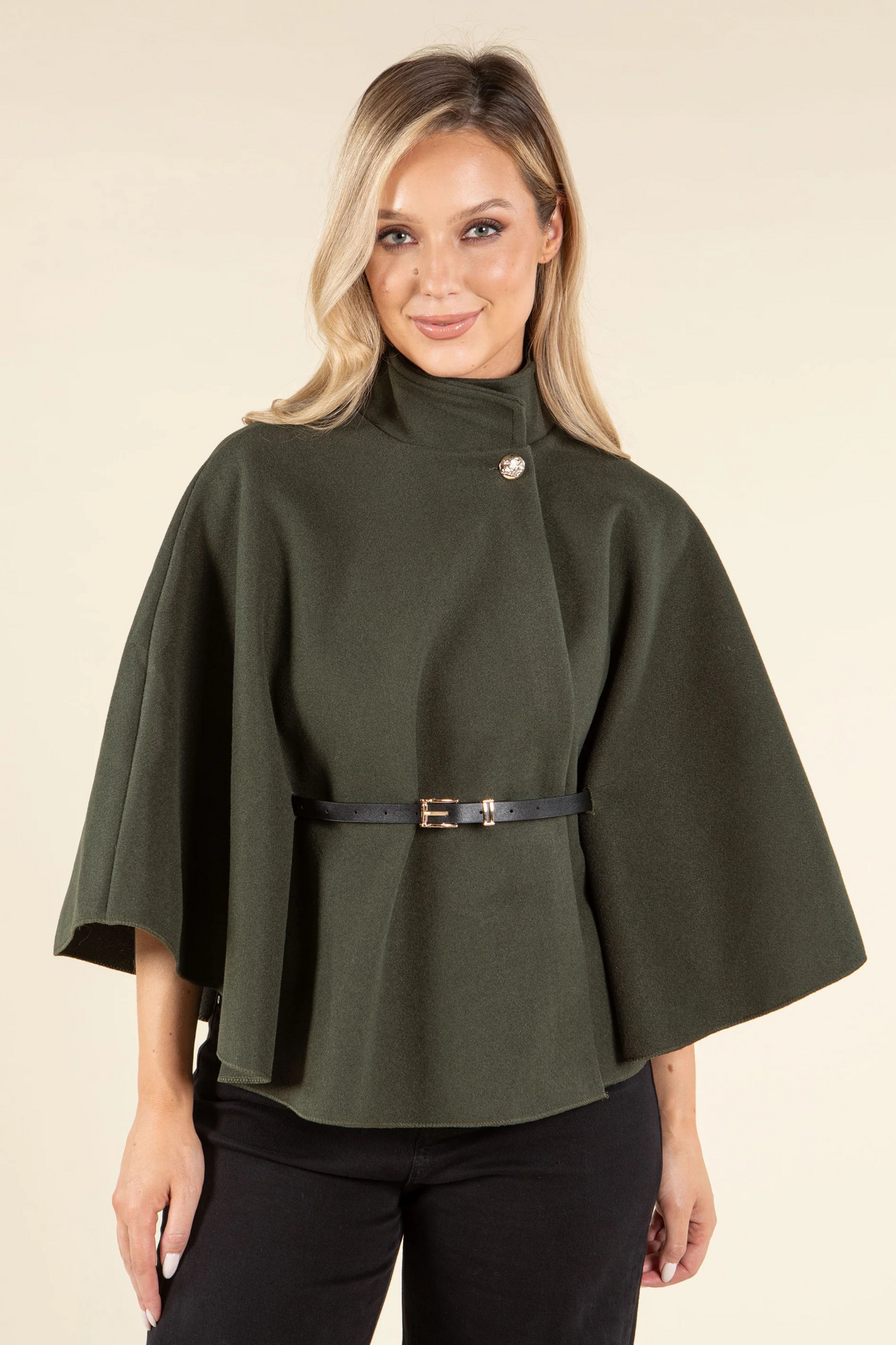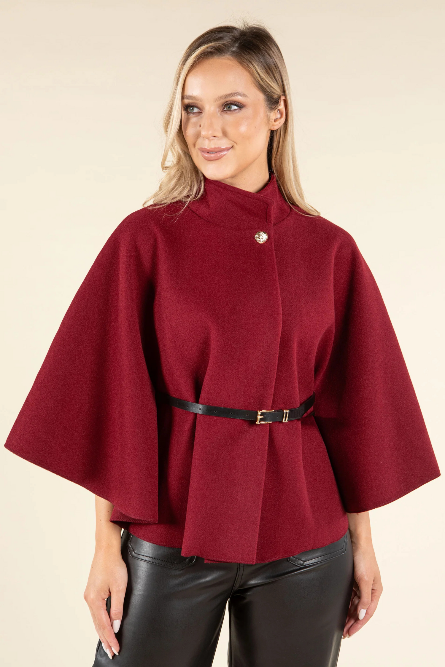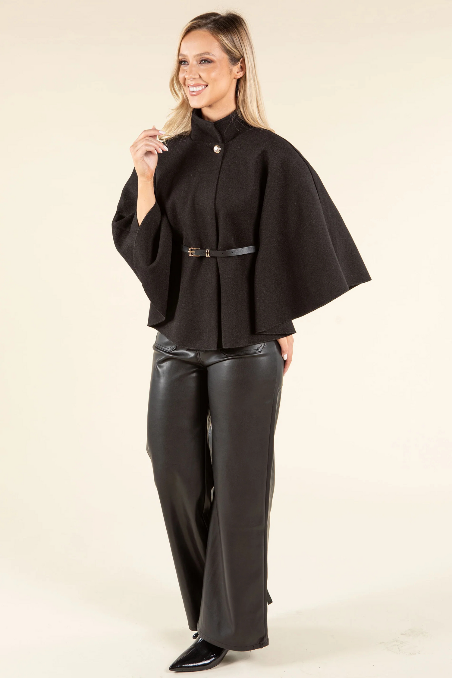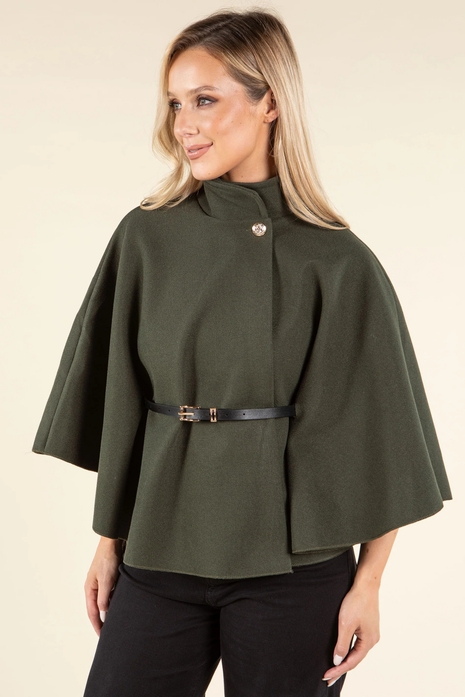 Dotée d’une fermeture à boutons et d’une ceinture ajustable ornée de finitions dorées, cette cape est conçue avec un col montant qui sublime la silhouette avec élégance et raffinement.