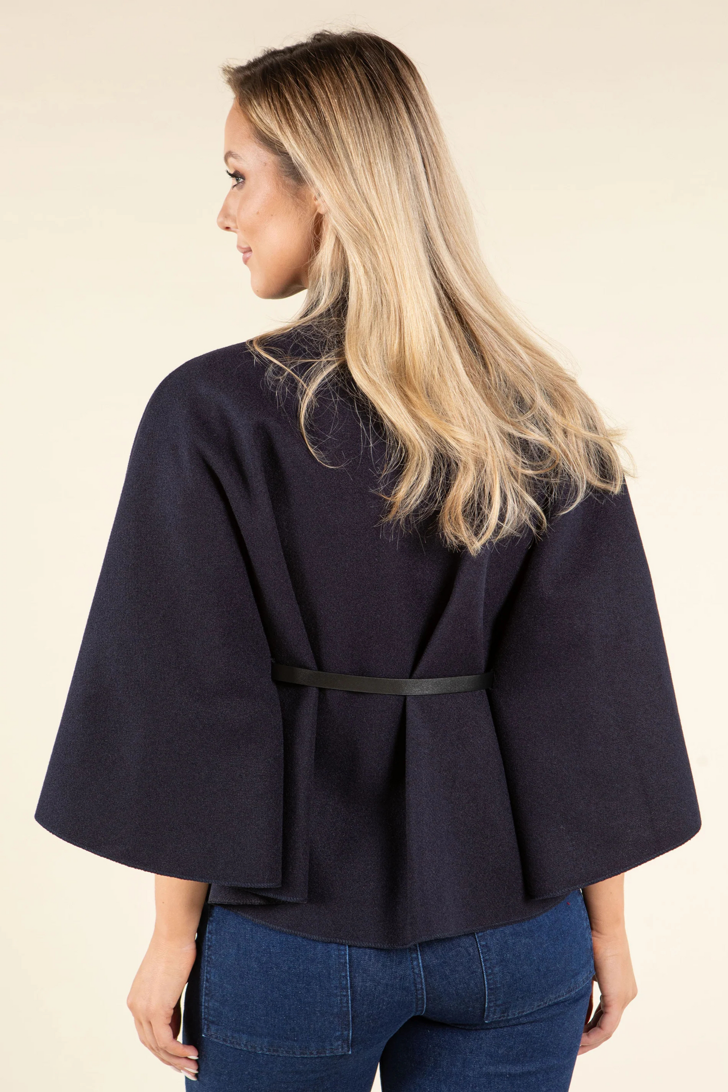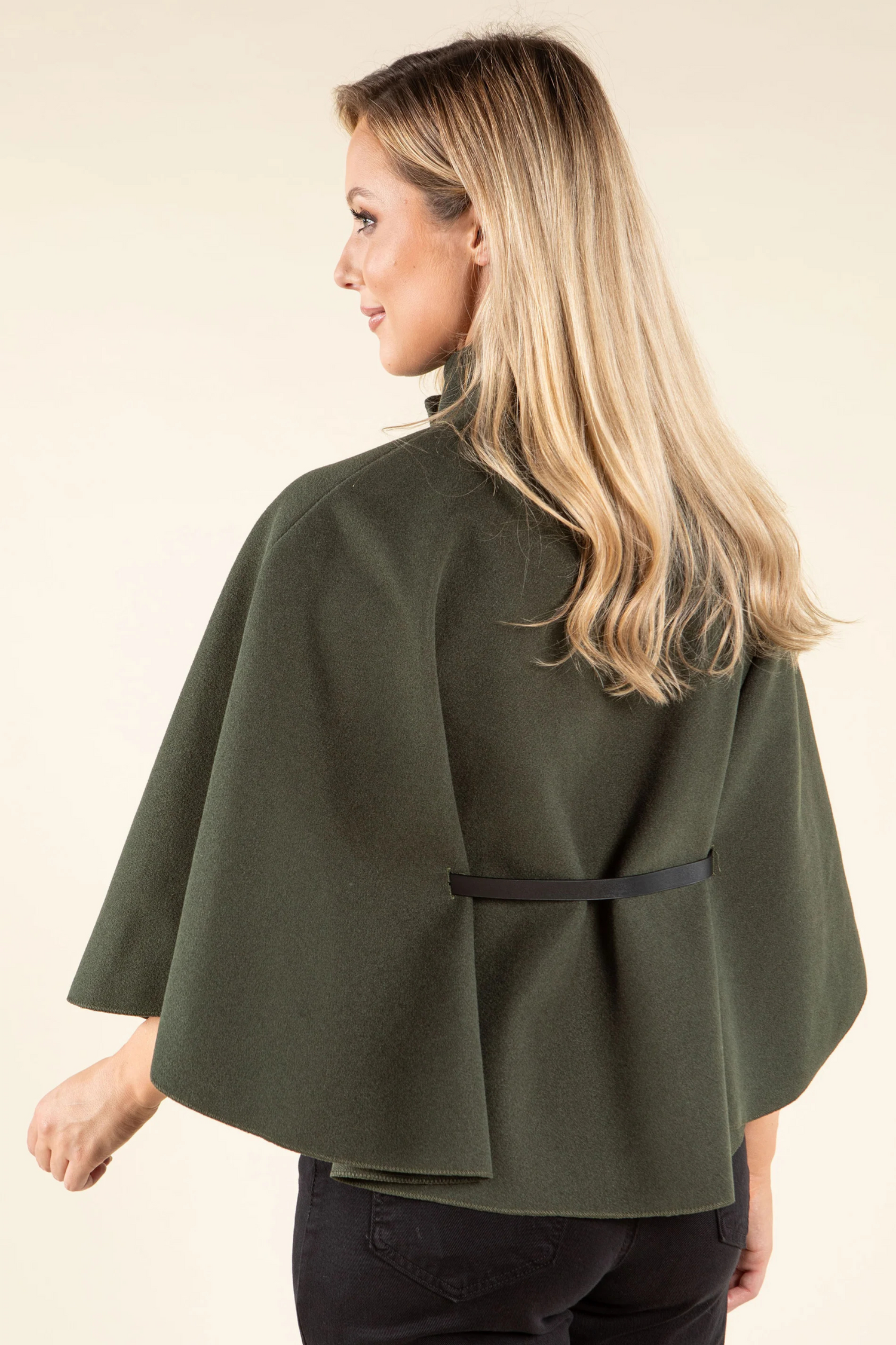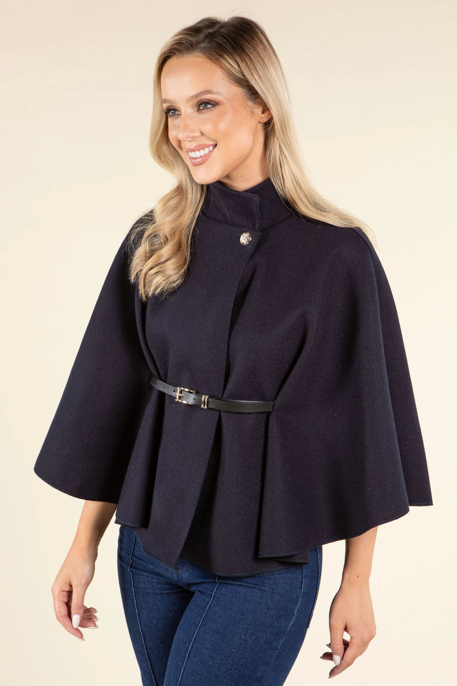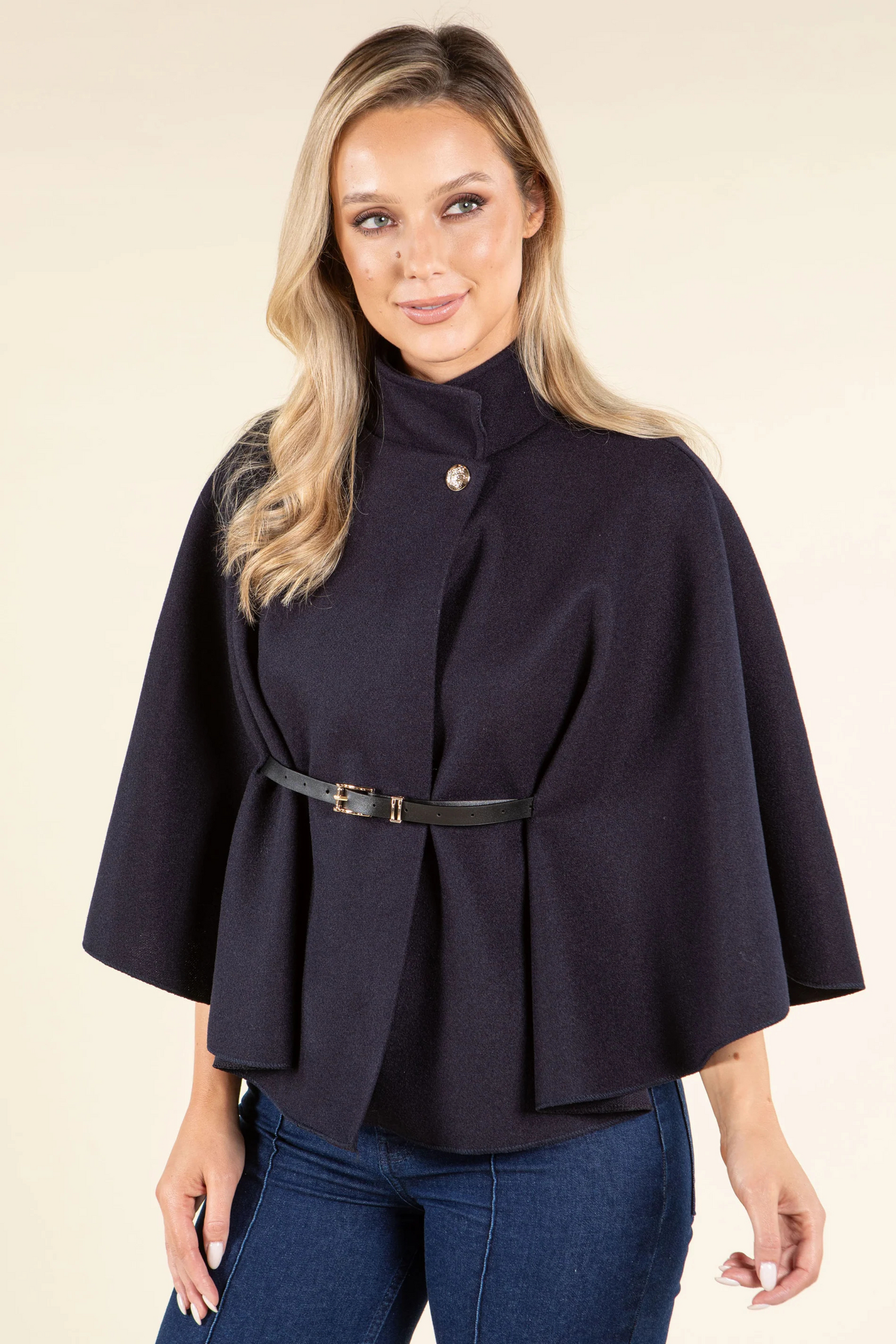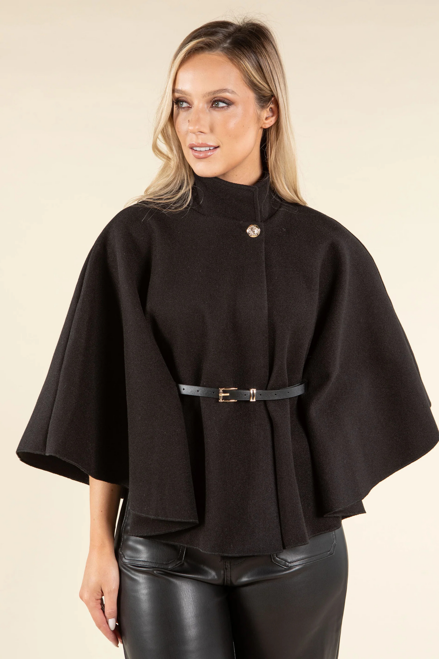 Dotée d’une fermeture à boutons et d’une ceinture ajustable ornée de finitions dorées, cette cape est conçue avec un col montant qui sublime la silhouette avec élégance et raffinement.