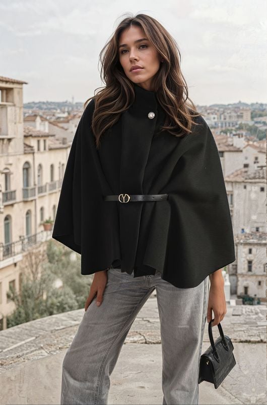 Dotée d’un col montant structuré, d’une ceinture ajustable et de détails dorés sophistiqués, elle redéfinit le chic intemporel. Sa coupe cape moderne sublime la silhouette avec légèreté et distinction, un véritable indispensable pour traverser la saison avec style et assurance.